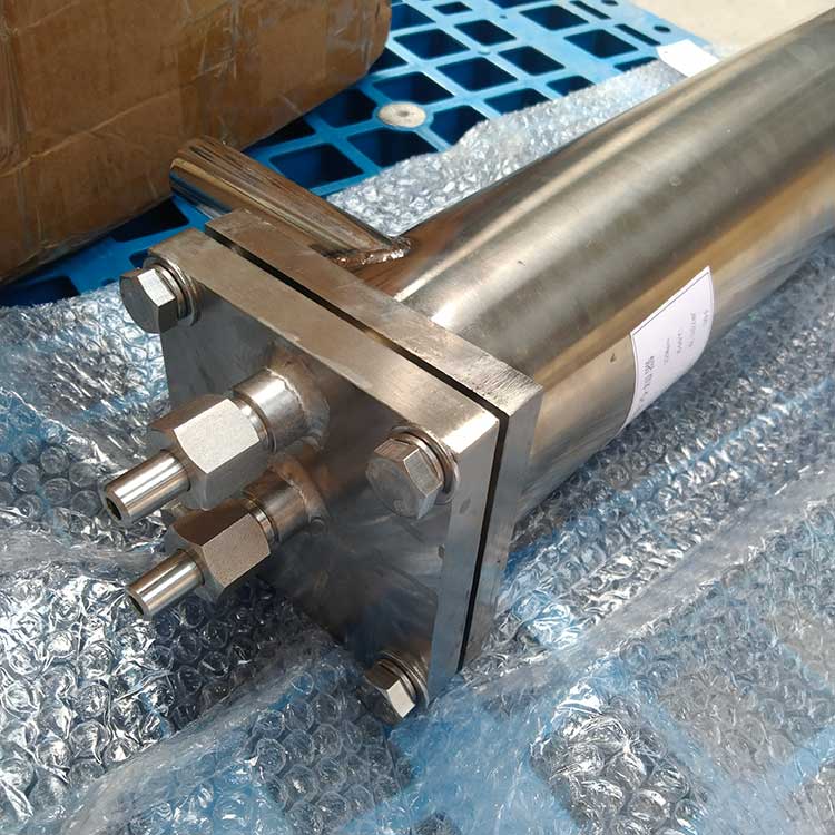 冷卻器由內(nèi)螺旋管、外螺旋管組成。共同安裝在一個(gè)筒體內(nèi)。外螺旋管在呈螺旋運(yùn)行的冷卻水中進(jìn)行熱交換;內(nèi)螺旋管在呈渦流運(yùn)動(dòng)的冷卻水中進(jìn)行熱交換,兩種冷卻水巧妙地匹配在一只冷卻器中進(jìn)行流動(dòng)。